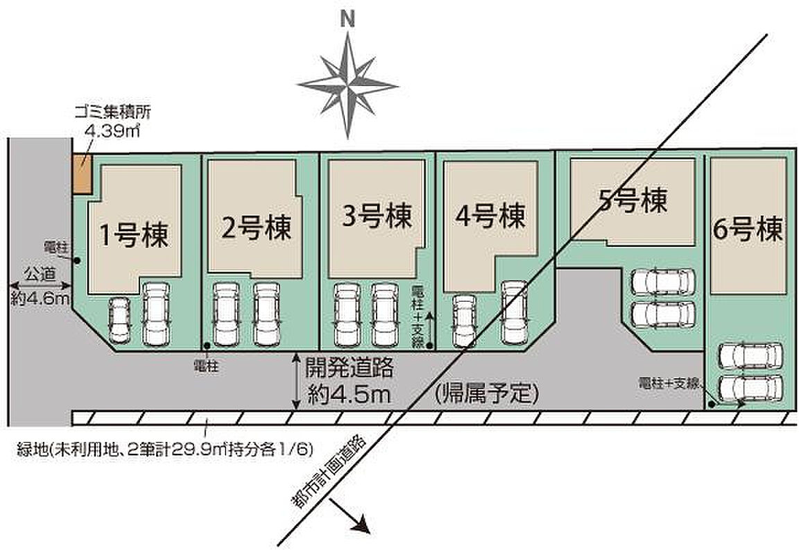 【接道】南約4.5m開発道路、西約4.6m公道 【設備】公営水道、東京電力、都市ガス、本下水 【都市計画道路】都市計画道路3.3.6号線、湘南新道(幅員25m)(4・5号棟) 【その他法令】防火指定/準防火地域、高度地区/第2種 【備考】5号棟は長期優良住宅の取得はございません。 【その他持分】【ゴミ集積所持分】4.39m<sup>2</sup>×各1/6【緑地(未利用地)持分】29.9m<sup>2</sup>×各1/6 |