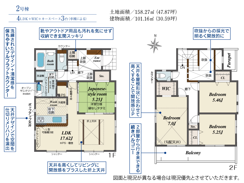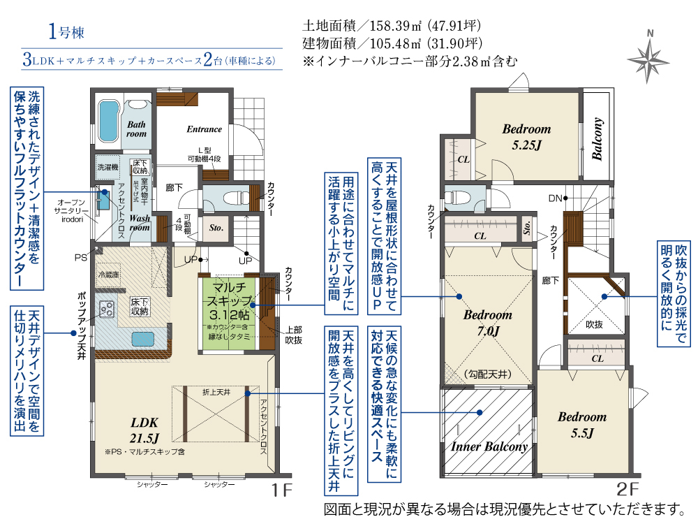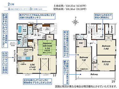 | 建物面積 | 101.16m2(約30.60坪)~105.48m2(約31.90坪) | 土地面積 | 158.27m2(約47.87坪)~158.39m2(約47.91坪) |