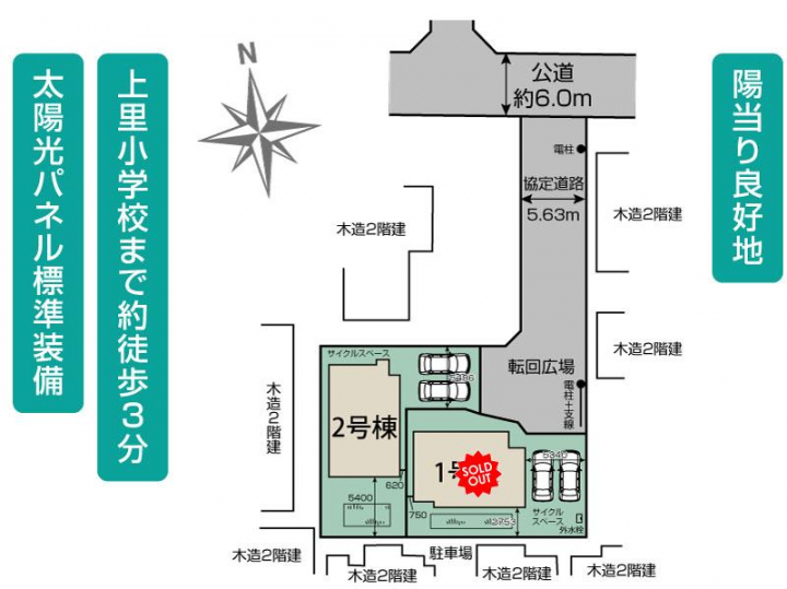 【接道】北6.0m公道 【設備】公営水道、東京電力、都市ガス、本下水 【協定道路】地役権設定(登記:買主負担) ※太陽光発電システムについてはリース契約になります。リース契約期間は10年間、毎月利用料金は(1)号棟9, 053円(税込)(2)号棟9, 053円(税込)がかかります。期間終了後は無償譲渡されます。※詳細は営業担当にお問い合わせください。 |
