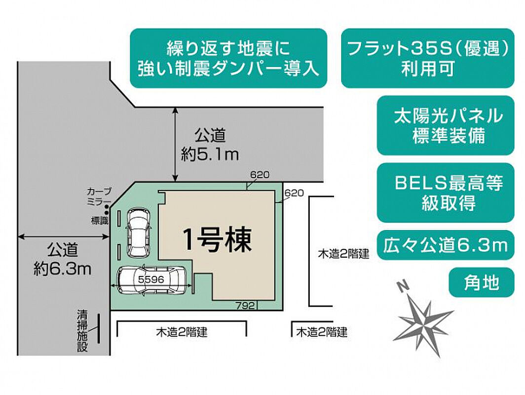 | 駐車場 | 2台 | 道路の幅員 | 北西6.3m公道、北東5.1m公道 |