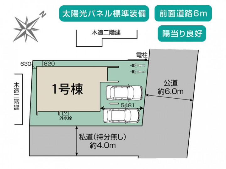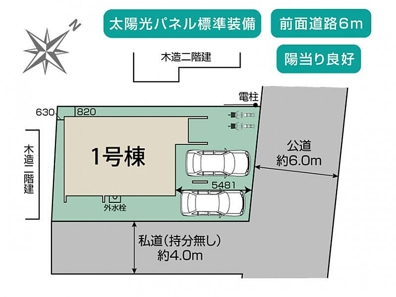 | 駐車場 | 2台 | 道路の幅員 | 北東6.0m公道、南東4.0m私道 |