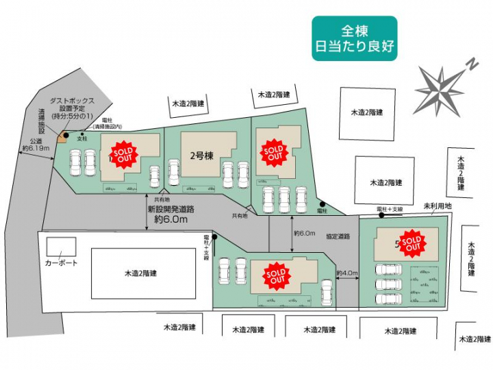 【接道】西5.5公道、北5.5公道 【設備】公営水道、東京電力、都市ガス、本下水 【その他交通】JR高崎線、JR湘南新宿ライン自転車11分(2.6km) 【協定道路】敷地面積に含む 地役権設定登記費用は買主負担となります。 【備考】太陽光発電システムについてはリース契約になります。リース契約期間は 10 年間、毎月利用料金は1、2、4号棟9,053円 (税込) 3号棟8,481円 ( 税込 ) 5号棟8,756円 ( 税込 )がかかります。期間終了後は無償譲渡されます。※詳細は営業担当にお問い合わせください。 【その他持分】【清掃施設】2.39m<sup>2</sup>×各1/5【共有地】1m<sup>2</sup>×各1/2(1号棟、2号棟)【共有地】0.84m<sup>2</sup>×各1/2(2号棟、3号棟) |