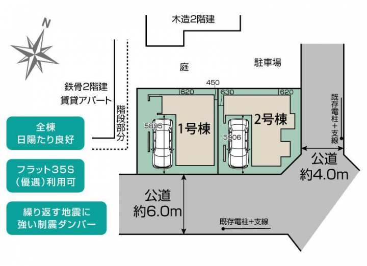 | 駐車場 | 1台 | 道路の幅員 | 南東6.0m公道、北東4.0m公道 |