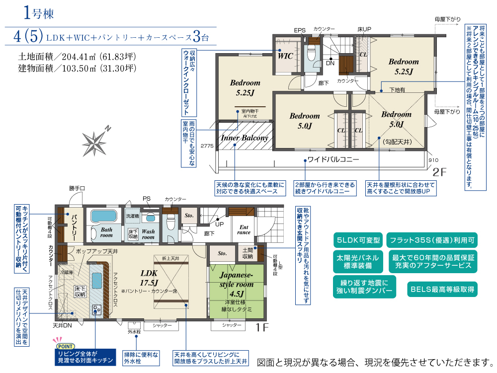 | 建物面積 | 103.50m2(約31.30坪) | 土地面積 | 204.41m2(約61.83坪) |