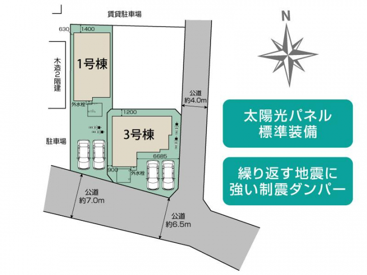 | 駐車場 | 2台 | 道路の幅員 | 南7.0m公道、東4.0m公道 |