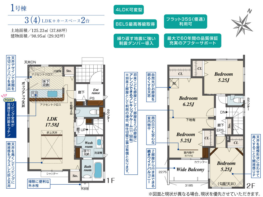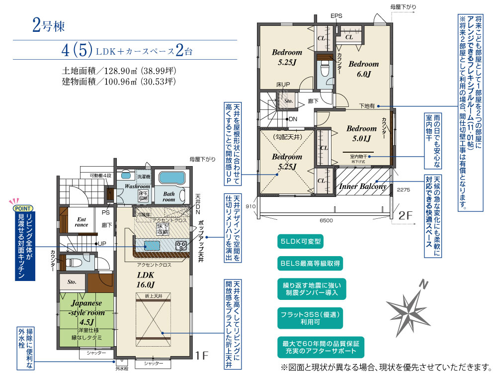 | 建物面積 | 98.95m2(約29.93坪)~100.96m2(約30.54坪) | 土地面積 | 125.23m2(約37.88坪)~128.90m2(約38.99坪) |