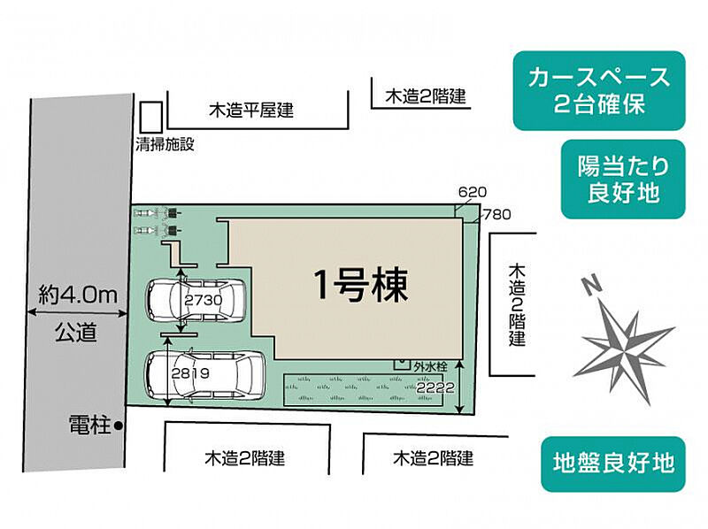 | 駐車場 | 2台 | 道路の幅員 | 西4.0m公道 |