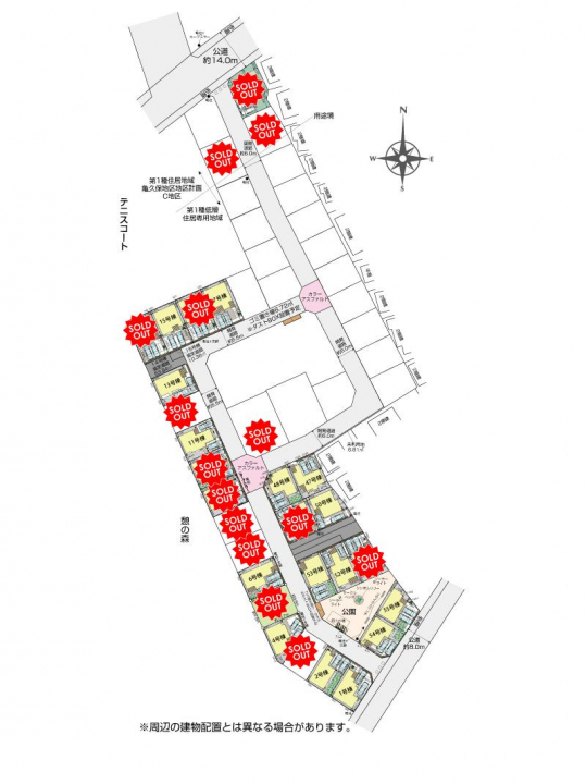 【接道】北14.0m公道、南8.0m公道 【設備】公営水道、東京電力、都市ガス、本下水 【都市計画道路】北側に「3・5・55亀久保中央線」幅員14.0mがありますが、整備済 【その他法令】埋蔵文化財⇒エリア外だが届出要 【その他交通】東武東上線「ふじみ野」駅まで自転車8~10分(2,100m) 【地区計画】亀久保地区:C地区に該当 【協定道路】49~53号棟、14、15号棟:協定道路につき地役権を設定させて頂きます。地役権設定の為に別途登記にかかる費用が発生致します。 ※公園と開発道路は市に採納(公園内に防火水槽あり) 【その他持分】【ゴミ置き場1】7.03m<sup>2</sup>×各1/55【ゴミ置き場2】6.72m<sup>2</sup>×各1/55【未利用地】6.81m<sup>2</sup>×各1/55 |