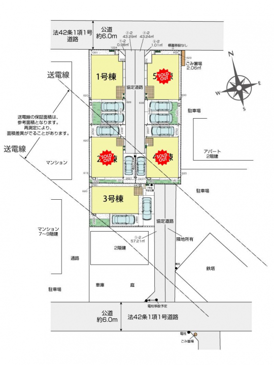 【接道】北6.0m公道、南6.0m公道 【設備】公営水道、東京電力、都市ガス、本下水 【その他法令】景観法:届出済、農地法:5条の届出済、まちづくり条例:許可済 【高圧線下】1号棟:8.12m2、2号棟:100.59m2(協定道路部分別途:3.91m2)、3号棟:116.30m2(協定道路部分別途:41.13m2)、4号棟:30.04m2(協定道路部分別途:0.59m2) ※協定道路につき地役権を設定させて頂きます。地役権設定の為に別途登記にかかる費用が発生致します。3号棟は、隣地所有者と地役権設定。 ※1、2、3、4送電線下に伴う保証がございます。 ※所沢市まちづくり条例第27条:第R070027号/令和7年7月3日 【その他持分】【協定道路】0.98m<sup>2</sup>×1/1(1号棟)【協定道路】43.29m<sup>2</sup>×1/1(2号棟)【協定道路】57.21m<sup>2</sup>×1/1(3号棟)【協定道路】43.24m<sup>2</sup>×1/1(4号棟)【協定道路】1.01m<sup>2</sup>×1/1(5号棟)【ゴミ置き場】2.06m<sup>2</sup>×各1/10※BOX設置予定、隣地敷地を経由してゴミ捨てを行う承諾書あり |