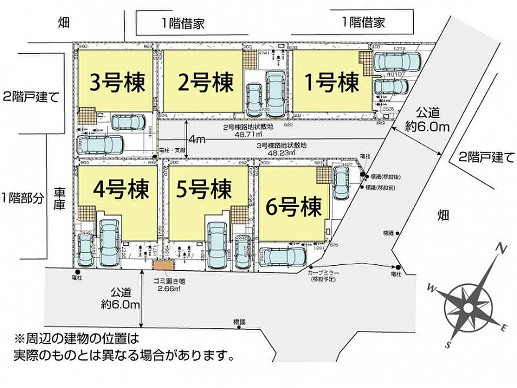 【接道】東6.0m公道、南6.0m公道 【設備】公営水道、東京電力、都市ガス、本下水 【交通】東武鉄道東上線「上福岡」駅まで自転車6分(1,700m) 【その他法令】農地法5条⇒届出済 【備考】(2)(3)号棟協定道路につき地役権を設定させて頂きます。地役権設定の為に別途登記にかかる費用が発生致します。 ※区画整理完了地 【その他持分】【ゴミ置き場】2.66m2×各1/6 ※BOX設置予定【協定道路】48.71m2×各1/1(2号棟)【協定道路】48.23m2×各1/1(3号棟) |