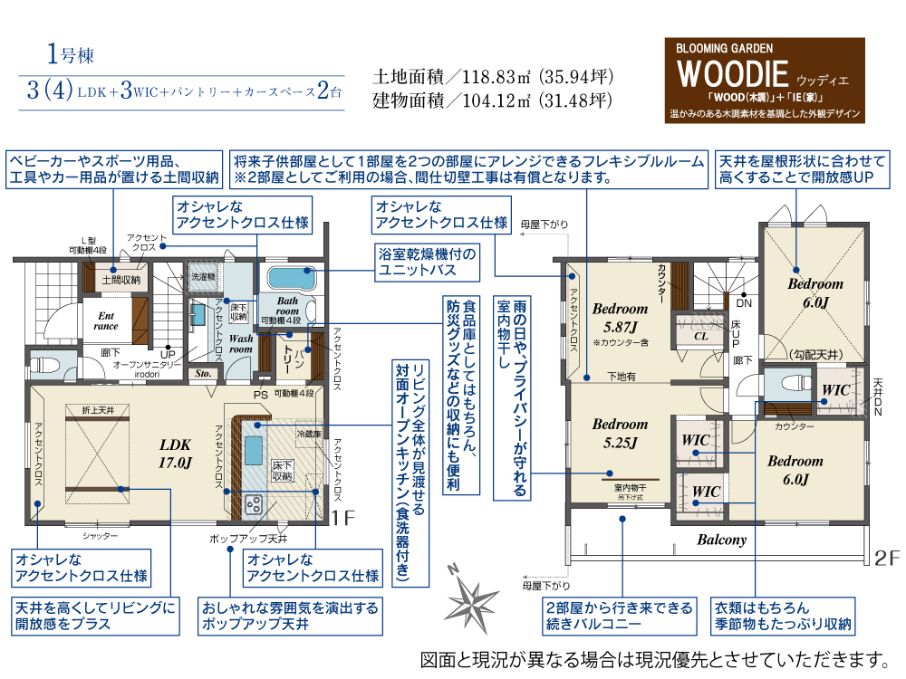 1号棟 間取り 3LDK 価格 4380万円 建物面積 104.12m2 土地面積 118.83m2 -