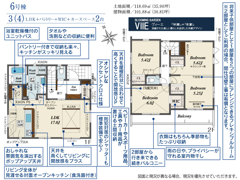 6号棟 間取り 3LDK 価格 3998万円 建物面積 101.88m2 土地面積 118.69m2