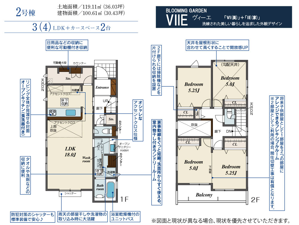 | 建物面積 | 100.49m2(約30.39坪)~103.86m2(約31.41坪) | 土地面積 | 119.11m2(約36.03坪)~122.05m2(約36.92坪) |