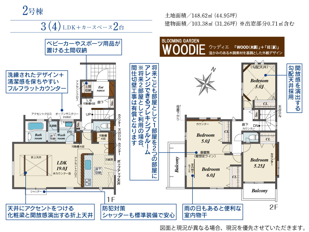 | 建物面積 | 103.38m2(約31.27坪)~103.86m2(約31.41坪) | 土地面積 | 148.61m2(約44.95坪)~148.62m2(約44.95坪) |