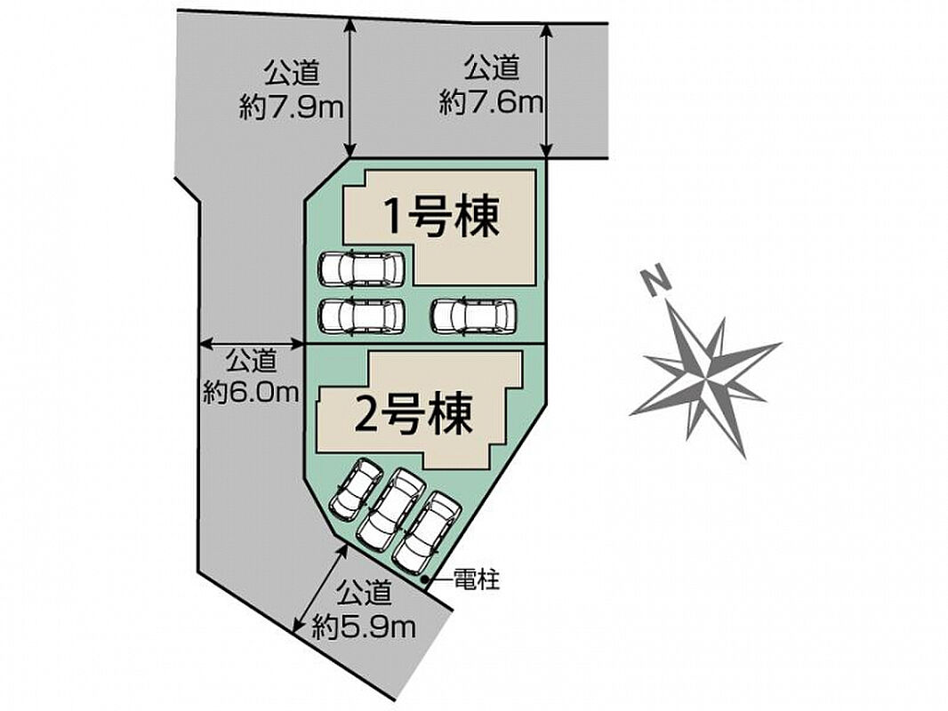 | 駐車場 | 3台 | 道路の幅員 | 北側約7.6m公道、西側約6.0m公道、南側約5.9m公道 |