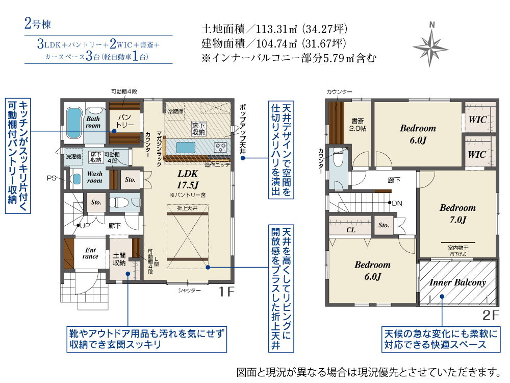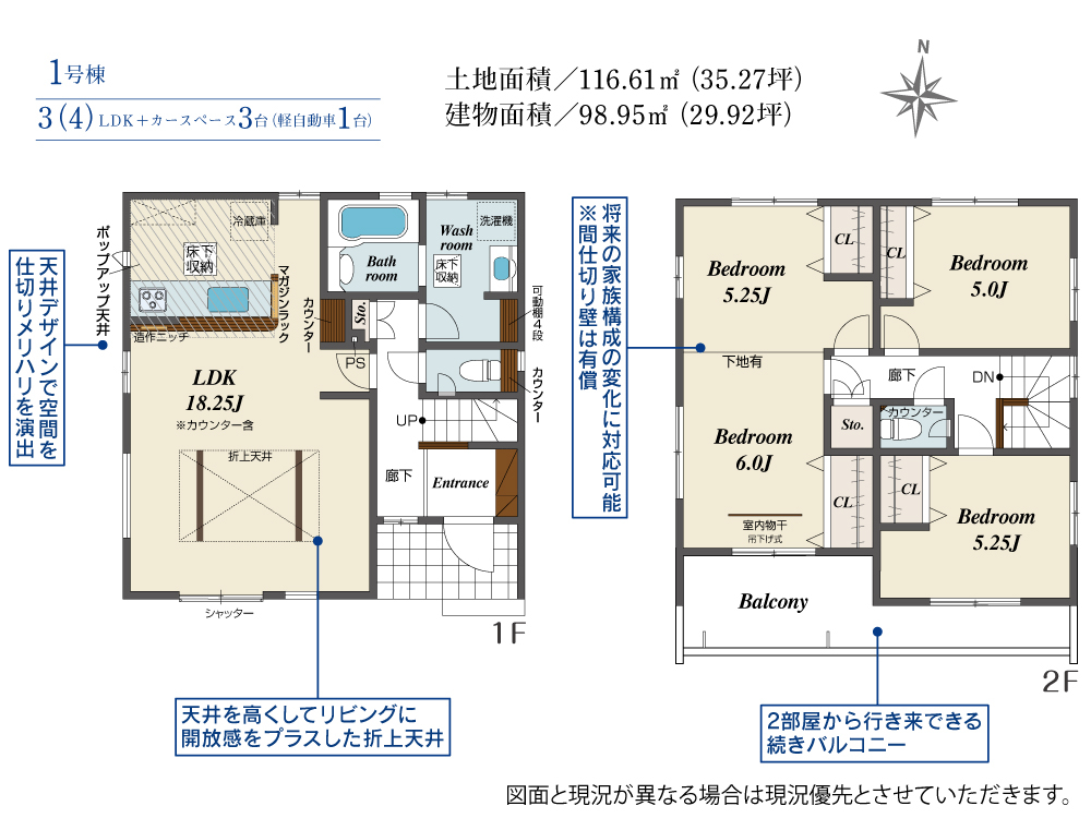 | 建物面積 | 98.95m2(約29.93坪)~104.74m2(約31.68坪) | 土地面積 | 113.31m2(約34.27坪)~116.61m2(約35.27坪) |