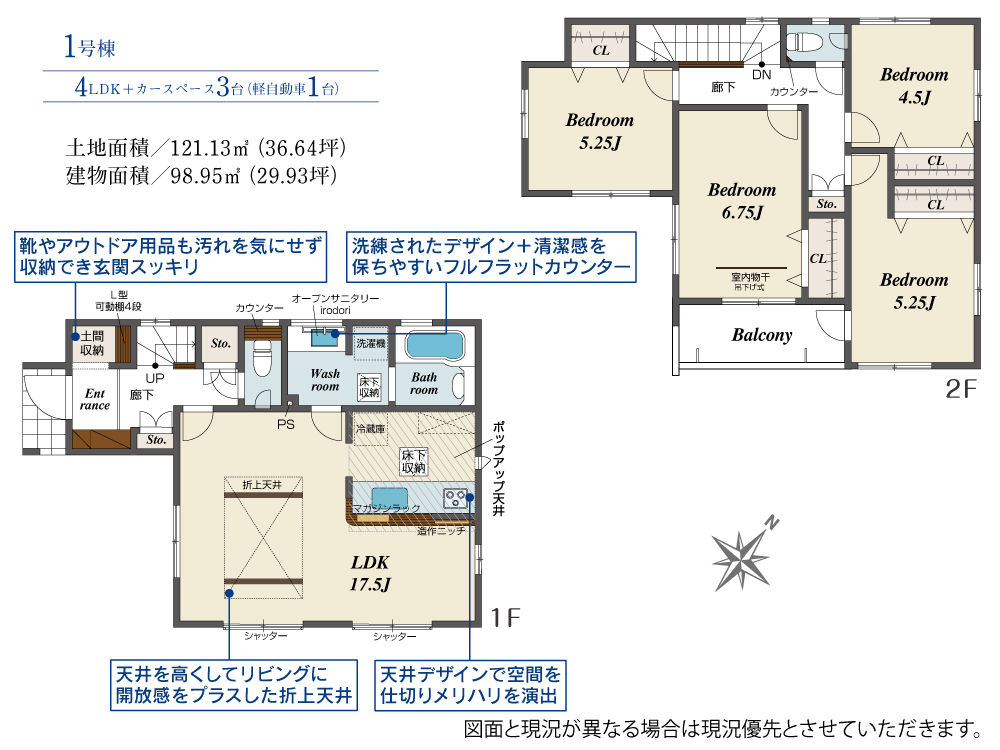 | 建物面積 | 98.95m2(約29.93坪)~99.36m2(約30.05坪) | 土地面積 | 121.13m2(約36.64坪)~159.97m2(約48.39坪) |
