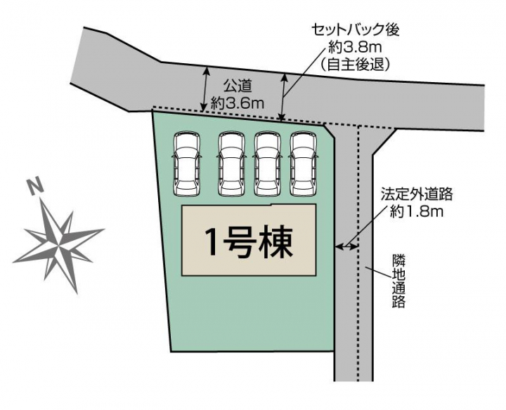| 駐車場 | 4台 | 道路の幅員 | 北3.6m公道(セットバック後約3.8m)、東1.8m法定外道路 |