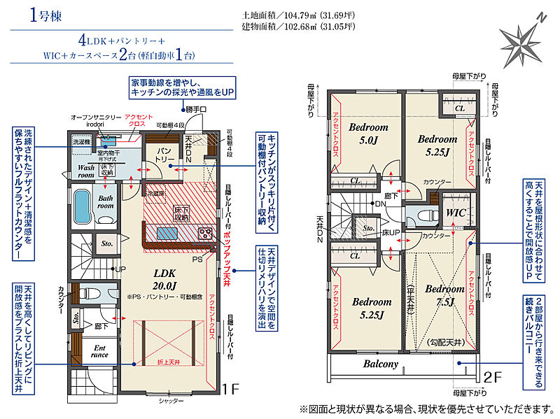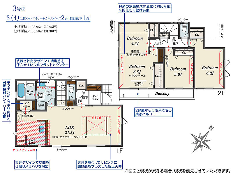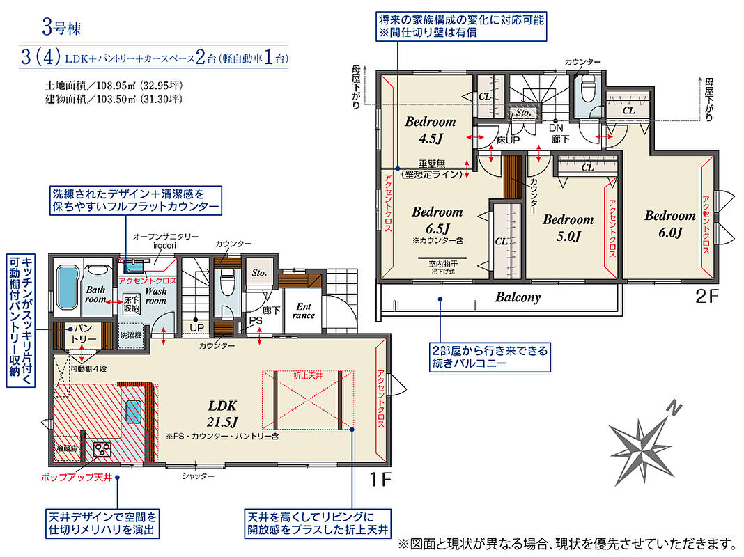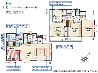 | 建物面積 | 102.68m2(約31.06坪)~103.50m2(約31.30坪) | 土地面積 | 104.79m2(約31.69坪)~108.95m2(約32.95坪) |
