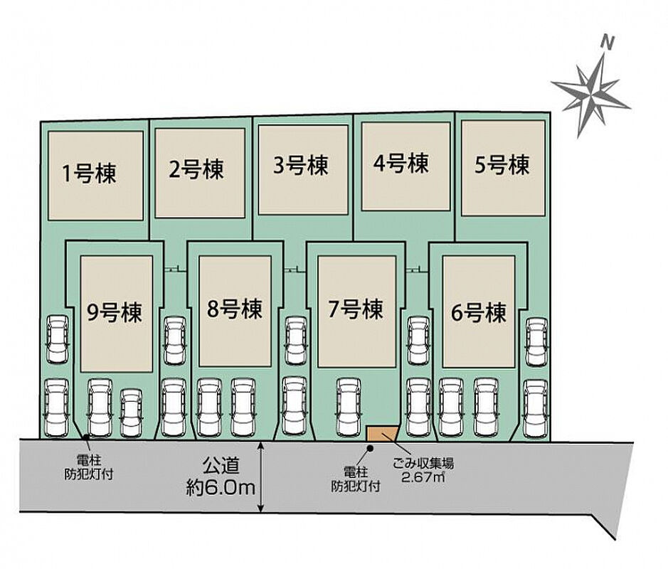 【接道】南6.0m公道 【設備】公営水道、東京電力、都市ガス、本下水 【セットバック】不要 【その他法令】景観法、宅地造成及び特定盛土等規制法 【路地上敷地部分面積】1号棟:41.60m2、2号棟:41.65m2、3号棟:41.64m2、4号棟:41.62m2、5号棟:41.63m2 |