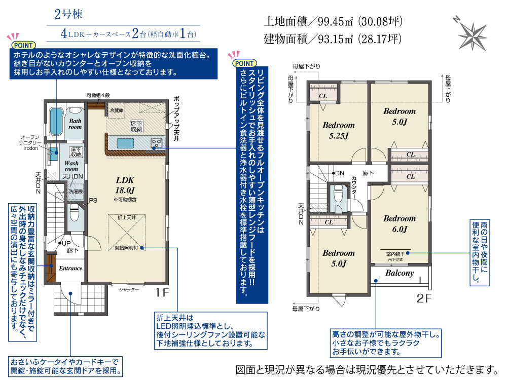 | 建物面積 | 93.15m2(約28.17坪)~96.05m2(約29.05坪) | 土地面積 | 99.45m2(約30.08坪) |