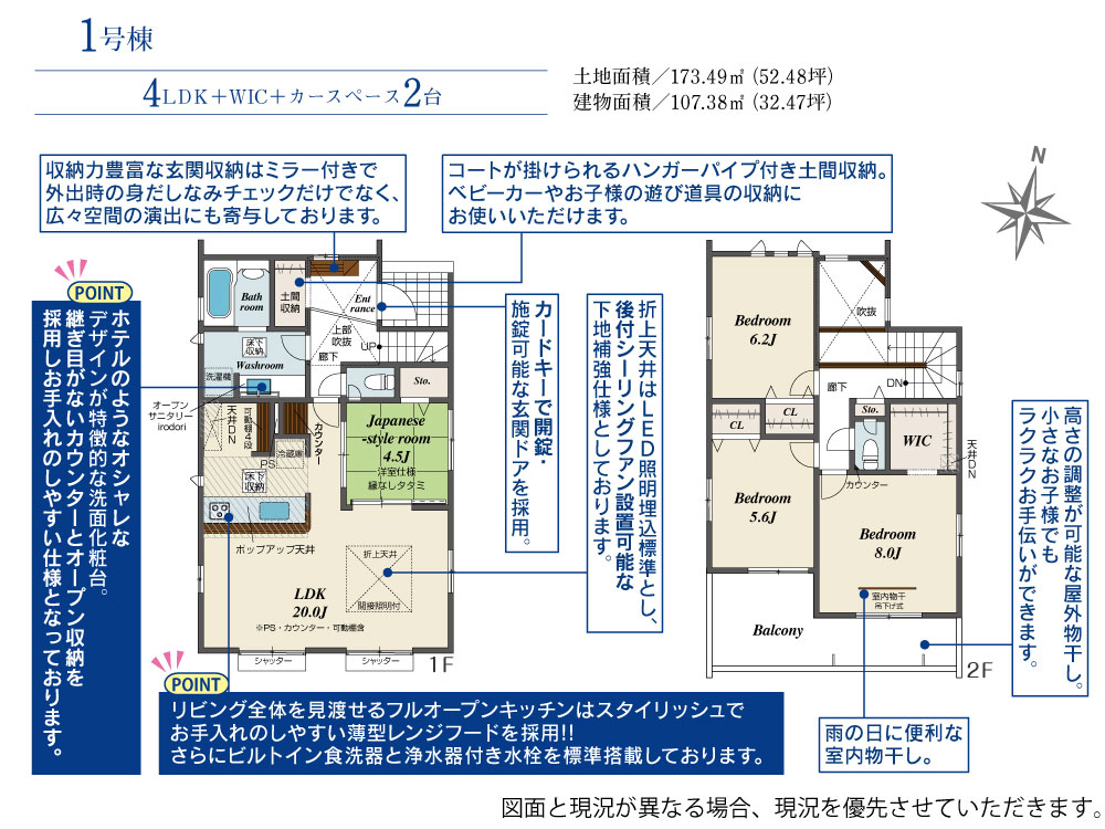 | 建物面積 | 104.13m2(約31.49坪)~107.38m2(約32.48坪) | 土地面積 | 173.49m2(約52.48坪)~175.80m2(約53.17坪) |