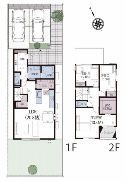 【1】駐車場2台+駐輪場スペース。植栽にて四季を感じながら家に帰るアプローチに。