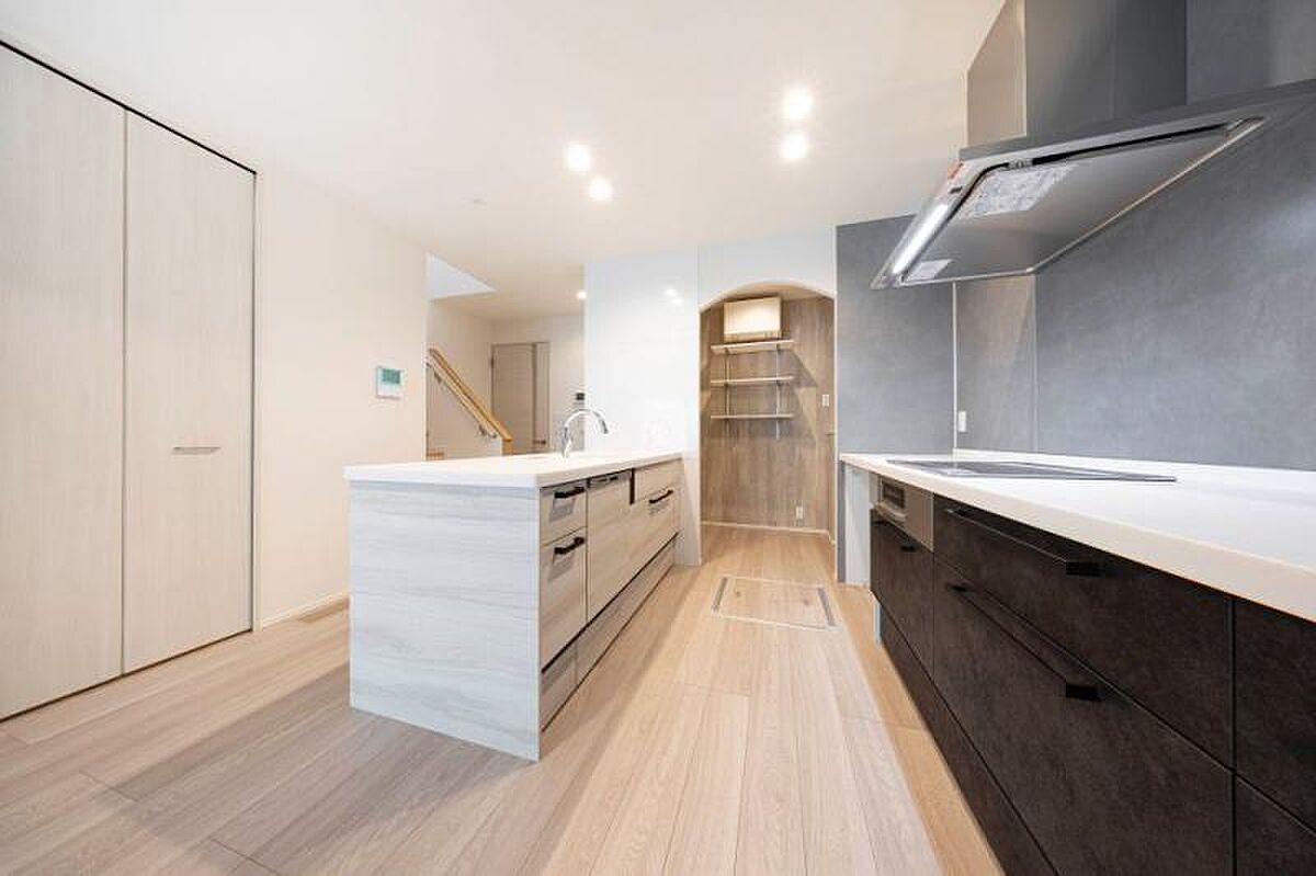 2列型オープンキッチンのサイドにパントリーとダイニングテーブル...