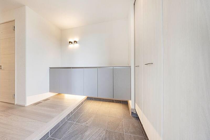 ゆとりのある玄関スペースに幅が広く収納力がある玄関収納。間接照...