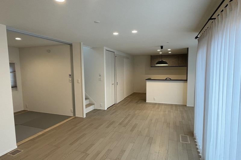 リビング横に続くタタミスペースは引戸を開けると一体感が生まれ、...