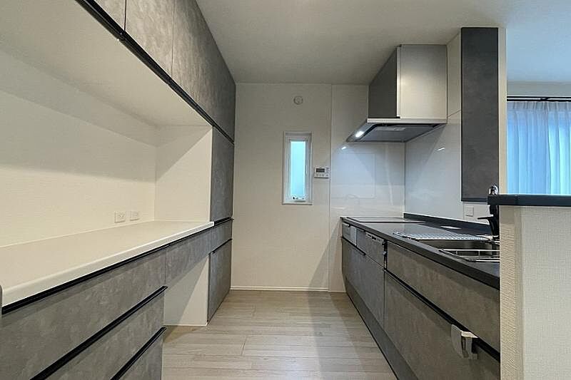 グレー系で統一されたリビングダイニングを見渡せる対面式キッチン...