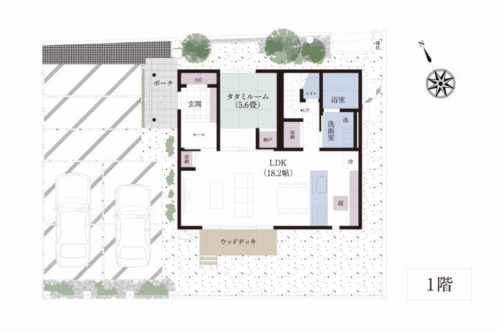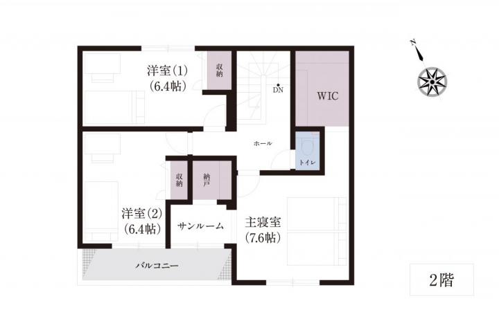LDKとタタミルームが隣接し、家族の成長や暮らし方の変化に合わせて使えます。サンルームは室内干しや家事スペースとして活用でき、各所に設けた収納とあわせて住空間を整えやすい設計です。