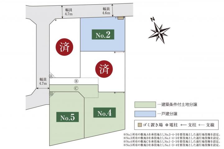 ■公式HPでプレゼント企画実施中!詳しくは公式HPへ! ■休業情報等については公式HPをご覧ください。 ■見学可能です。 ■ご来場について: 営業時間内でも、ご予約のお客様がいらっしゃらない場合、分譲地にスタッフが不在の場合もございます。 WEBまたはお電話にてご来場の予約をいただき、お越しくださいませ。 尚、メールやお電話でも各種ご相談を承っておりますので、お気軽にお問い合わせください。 --------- ■別途、共用持分としてごみ置場2.09m2(宅地)の1/5持分あり ■No.1所有の敷地Aを承役地とし、要役地をNo.3・4・5とする通行地役権を設定。 No.3所有の敷地Bを承役地とし、要役地をNo.1・4・5とする通行地役権を設定。 No.4所有の敷地Cを承役地とし、要役地をNo.1・3・5とする通行地役権を設定。 No.5所有の敷地Dを承役地とし、要役地をNo.1・3・4とする通行地役権を設定。 ■景観条例あり ■まちなみガイドラインがあります。 ■建物仕様について、太陽光発電システム・HEMS・EVコンセントの設置を条件とします。 ■先着順申込受付中の物件は、申込済・契約済の場合がありますので、ご了承ください。 ■お申込の際には、お認印・収入証明書(給与収入のみの方:直近2年分源泉徴収票、 給与収入のみ以外の方:確定申告書一式の写し[直近3期分]・身分証明書(運転免許証等)が必要です。 ■掲載の図面は計画段階の図面を基に描き起こしたもので、実際とは異なる場合があります。 また、施工上やむをえない変更が生じた場合は、建物竣工時の状態を優先します。 ■まちなみ画像・CGには販売済区画を含む場合がございます。最新の販売状況は区画図等をご参照下さい。 ■家具・調度品等は販売価格に含まれません。 ■お引渡時期については、諸手続き完了後となります。ただし造成・建築中の物件については、完工後のお引渡となります。 |