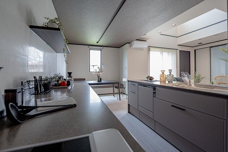 上部に吊戸を設けず開放感◎細身のブラックの手すりや水栓などにより洗練された印象です。食器洗い乾燥機などの時短設備を備えています。