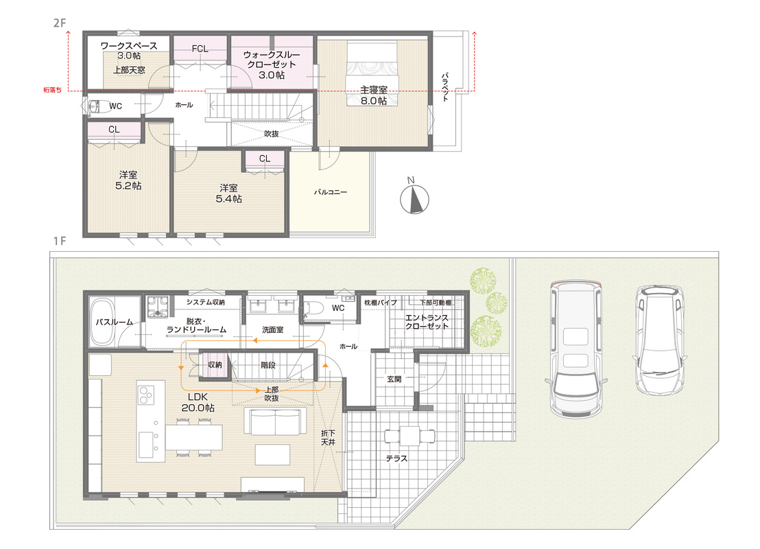 ・約20帖LDKは上部吹抜×アイランドキッチンやリビング階段がオシャレ。