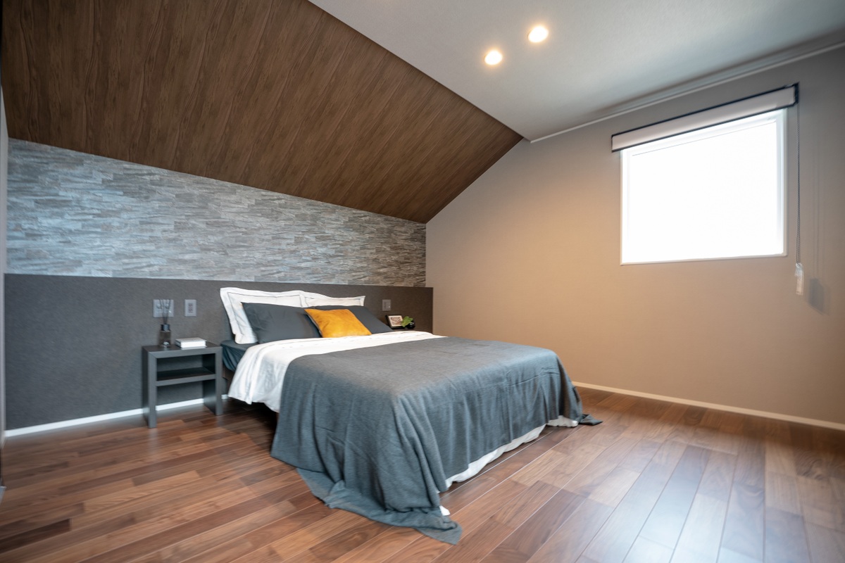 主寝室は一部勾配天井に。ベッドを配置し天井を見上げると、縦方向...