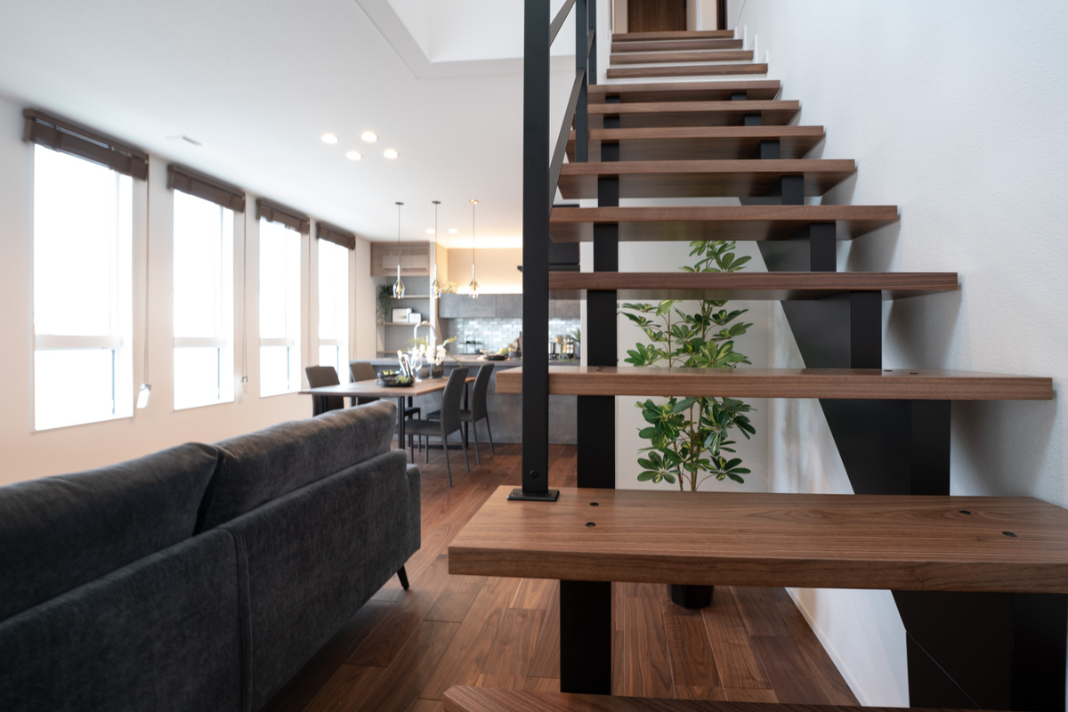空間にリズム感をもたらすスケルトン階段や4連窓。吹抜けから光や...