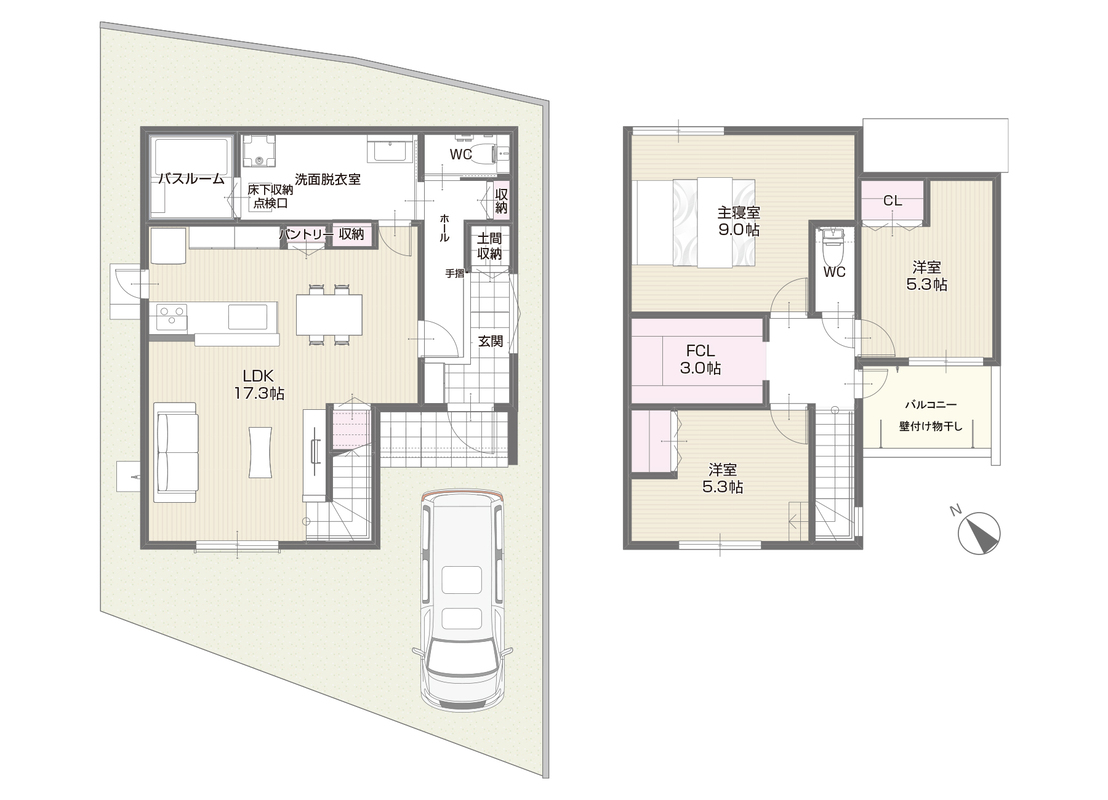 ホール、サニタリーやパントリー、2階約3.0帖FCLなど、適材適所に収納を配置。スッキリと片付き、邸内を広くお使いいただけます。