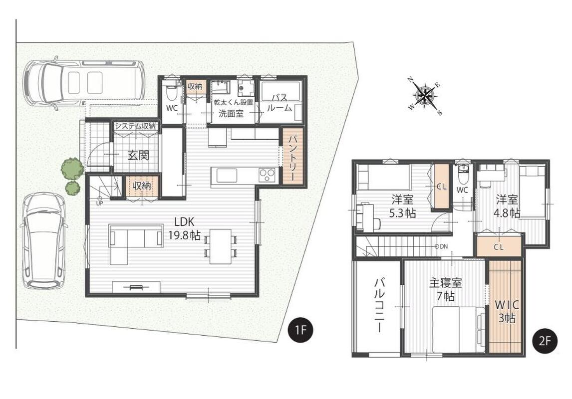 | 建物面積 | 95.75m2・98.89m2(28.96坪・29.91坪) | 土地面積 | 125.89m2・129.11m2(38.08坪・39.05坪) |