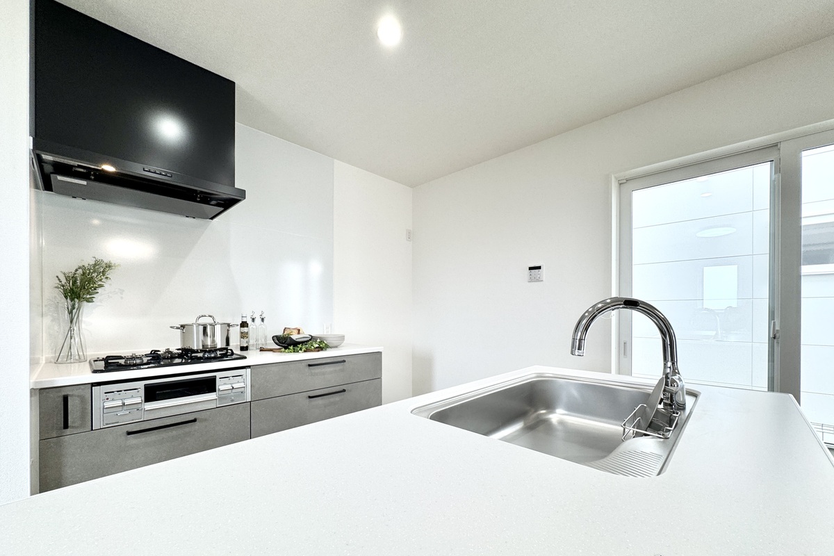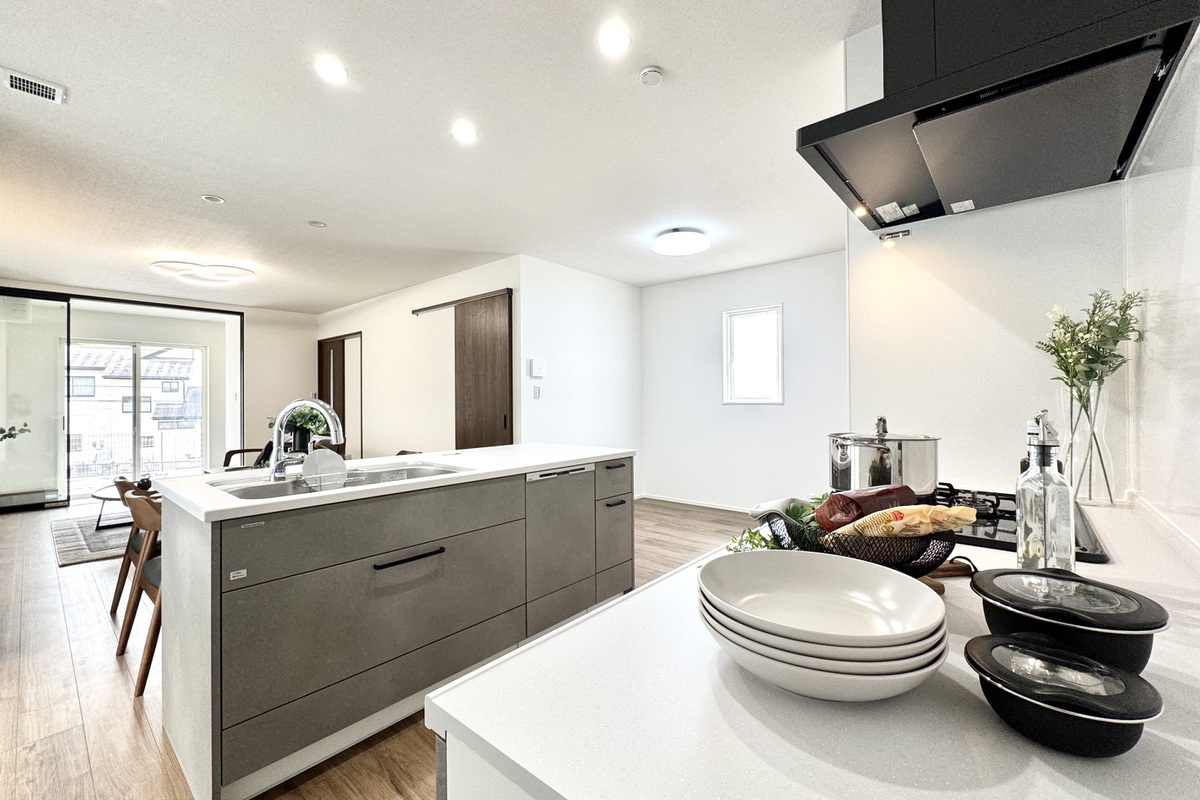 (2)約21.7帖の広々リビングには、家族みんなでお料理を楽しめるセパレートタイプのキッチンを採用。自然と会話が生まれるとともに、生活力や家族の絆が深まります。