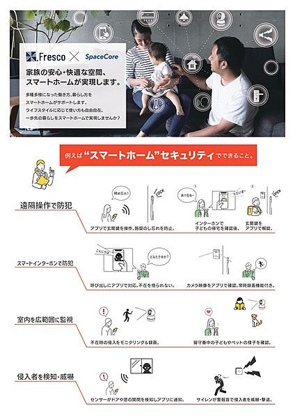 ~フレスティア船橋法典~ ・生活利便施設 商業施設まで徒歩9分圏内 市川市立柏井小学校 徒歩16分 ・防犯性を高めた住居が集まる大規模分譲地内区画 スマートホームセキュリティSpaceCore搭載 ・邸別設計が魅力の開放感あふれる住まい キッチンから住まいを考えたそれぞれの3邸 リビングダイニング19.9~21.7帖/家族が共に過ごせる大空間 ・開放感あふれる2階リビングの家(24号棟) ・サンルームのような土間リビングのある家(28号棟) ~コンセプト~ 安心に裏付けされた上質な暮らし 防犯性を高めた「守られた環境」で こころが満たされる憧れの暮らしを叶える 利便性の高い大規模分譲地に立地する「フレスティア船橋法典」。 外出時も在宅時も安心の、次世代型防犯システムを搭載したセキュリティスマートタウンです。 この安心の地に、伸びやかに暮らせる3邸が誕生しました。 個性豊かな邸別プランが特徴で、それぞれ開放感あふれた空間が魅力です。 食生活のベースとなるキッチンスタイルも邸別にご用意。 安心できる住環境だからこそ、こころ満たされる上質な暮らしが叶います。 ~防犯対策の重要性の高まりとスマートホーム技術力の革新~ 家族の安全を守るセキュリティシステム 「スマートホームセキュリティSpaceCore」搭載 現代の住宅では、スマートホームの急速な技術革新により、暮らしをより快適に、安全にすることができるようになりました。 フレスティア船橋法典では、スマホひとつで住まいのセキュリティ管理や安全確認できるアクセルラボ社の「スマートホームセキュリティSpaceCore」を採用。 ランニングコストをかけることなく、年々増えている住宅侵入犯罪への防犯対策を可能にしています。 住まいは、より賢く、より安全に進化 スマートセキュリティ 新しい住宅犯罪には、新しいセキュリティを。 急増する住宅への侵入犯罪はその手口も変化。宅配業者へのなりすましなど在宅時でも被害に遭うケースが増えています。警備員のみに頼る方法ではなく、即座に威嚇し、犯行を諦めさせるテクノロジーを駆使した「新しいセキュリティ」が求められています。 (1)24時間いつでも見守り 訪問者の有無に関わらず、24時間録画。専用アプリにはインターフォン機能も搭載しています。 (2)月々のランニングコストは無料 月額プランの警備会社と違い、コストがかかるのは設置費用のみ。専用アプリのシステム更新にもコストがかからず、安心してお使いいただけます。 (3)スマホひとつで防犯対策 玄関のインターフォン呼び出しに遠隔対応できるだけでなく、玄関ドアの施解錠や窓の開閉状況など、オンタイムで確認可能です。 (4)サイレンが安全に撃退 不在時の侵入には、警報音で威嚇し犯行阻止を促します。在宅時でも、即座に侵入を察知でき、速やかに避難へ導きます。 「フレスティア船橋法典」は、防犯システムを備えたセキュリティスマートタウン。スマホひとつで、玄関の施錠や窓の開閉状況を確認でき、外出時も在宅時も安心です。24時間録画機能とサイレンによる侵入対策に加え、月々のランニングコストがかからないことも魅力。家族の安全を守りながら、快適に毎日を過ごすことができます。 |