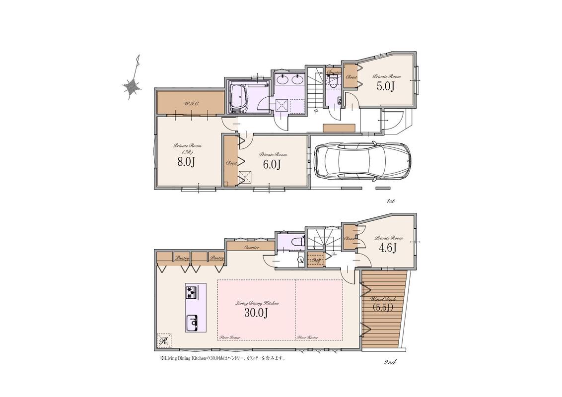 | 建物面積 | 136.40m2(車庫面積 13.12m2含む) | 土地面積 | 102.03m2 |