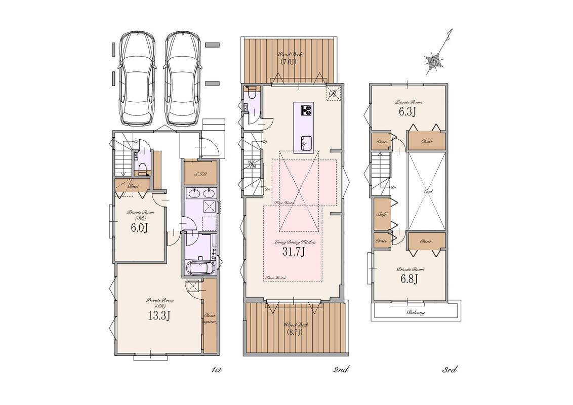 | 間取り | 3LDK+1S~2LDK+2S | 建物構造 | 木造ストレート葺 3階建て(制震住宅+耐震住宅) |