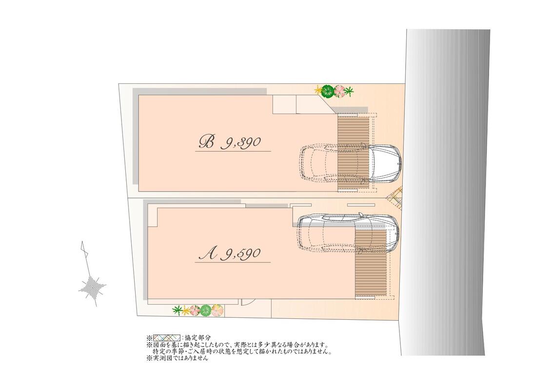 | 建物面積 | 86.14m2(車庫・駐輪場面積11.15m2含む)~86.60m2(車庫・駐輪場面積12.12m2・外部面積0.09m2含む) | 土地面積 | 75.07m2~75.23m2 |