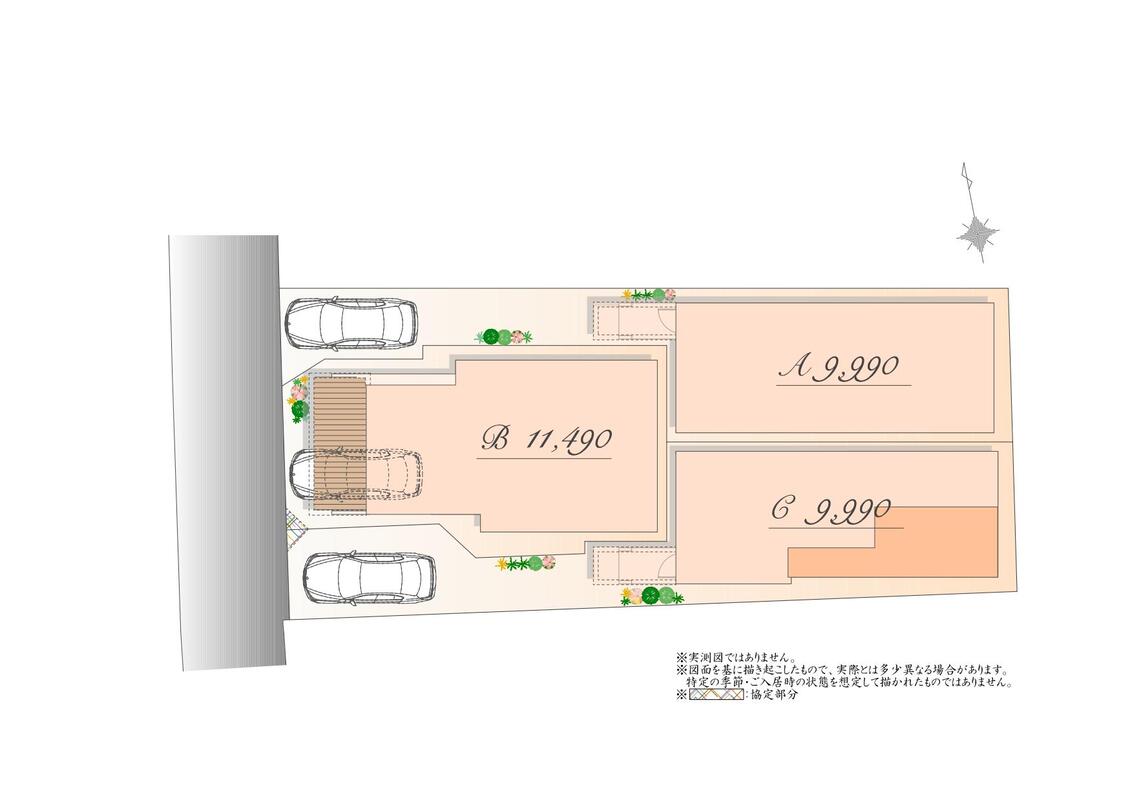 | 駐車場 | 有り | 道路の幅員 | 西側約4.0m私道(SB後) 別途私道負担面積 SB部分 A号棟 2.30m2他 |
