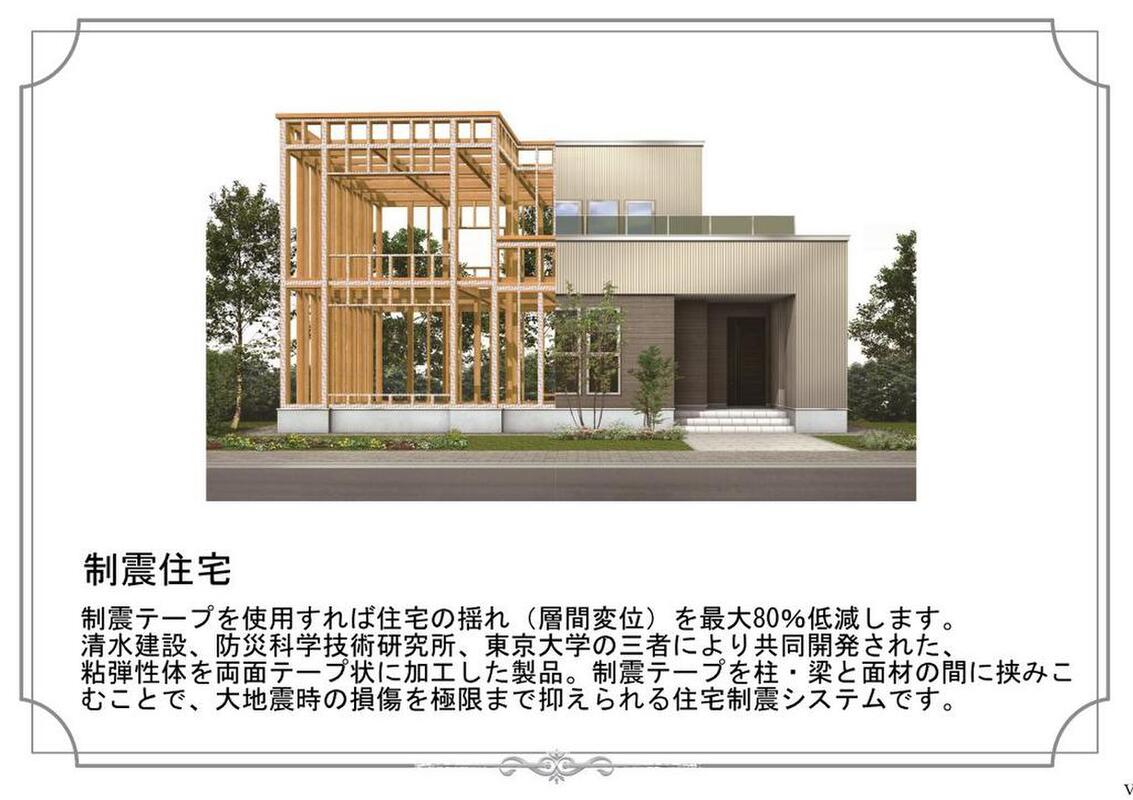 - 制震テープを構造合板や石膏ボード等と柱梁の間に介在させることにより、建物全体の体質改善が図られ、「制震住宅」となります。その結果、地震のエネルギーが吸収され(制震効果)、建物の応答変位を約80%低減します。