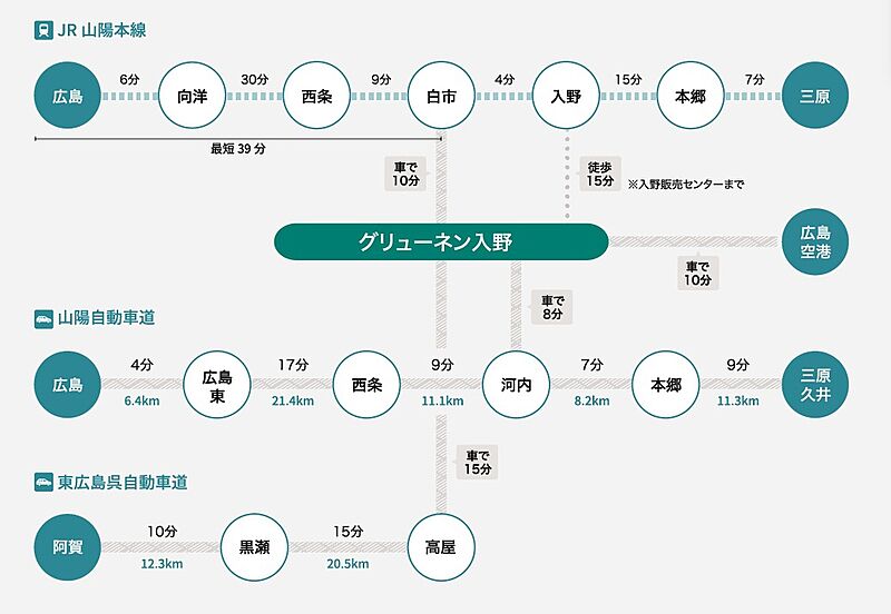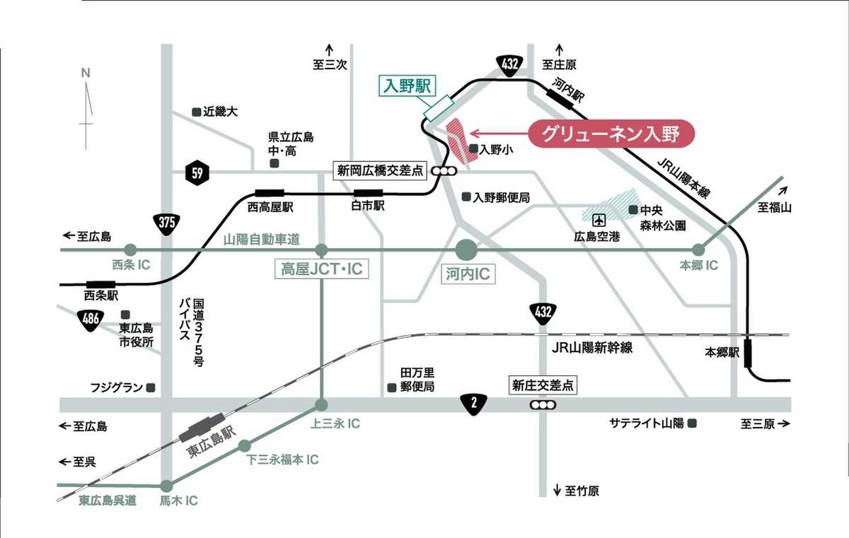 JR入野駅まで徒歩約15分、山陽自動車道河内ICへも車で約6分。通勤・通学にも便利な好立地です。