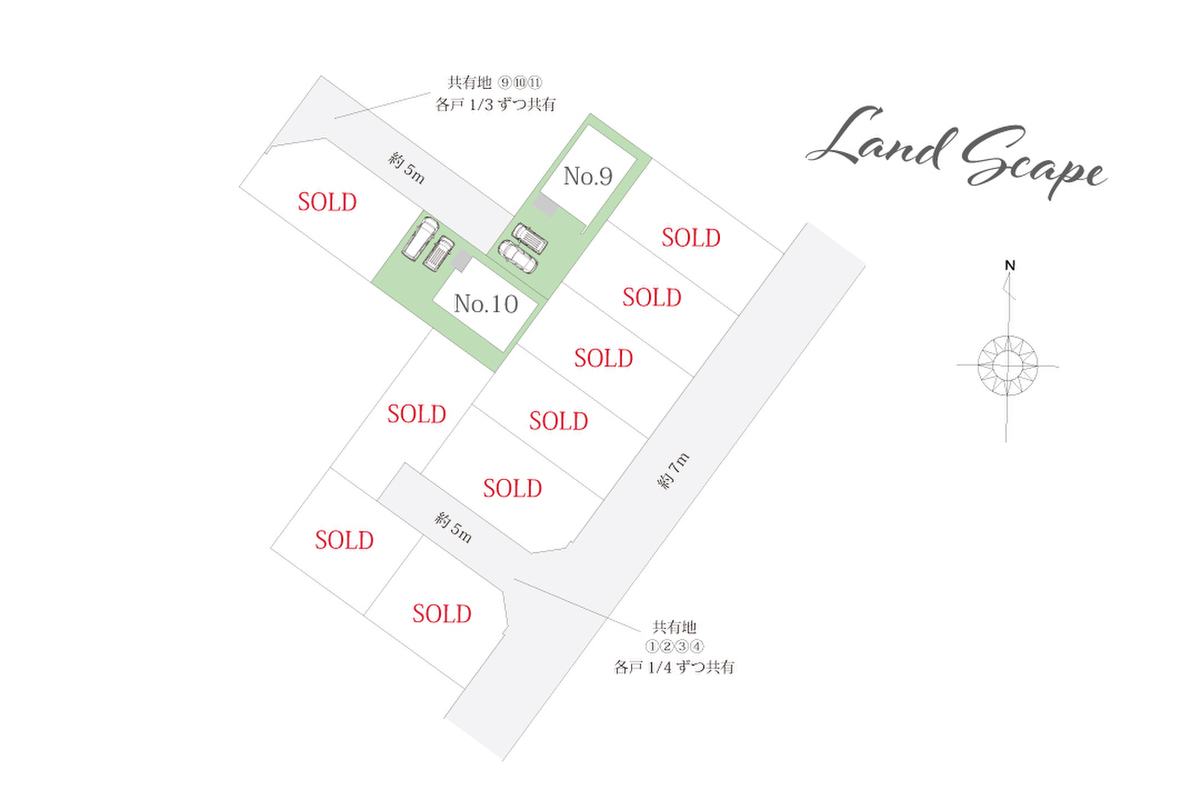 | 駐車場 | 2台 ~ 3台 | 道路の幅員 | 団地内道路幅員約5m私道に接す、東南側道路幅員約7m公道に接す、私道負担あり(備考に記載) |