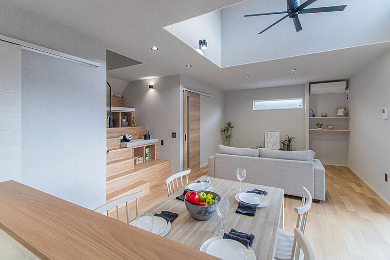 デザイン階段を採用した1号地は、家族の集い場となるような思いを込めて「きざはし」と命名。お子様とお話したり本を読んだり、腰かけたりできる場所になります。