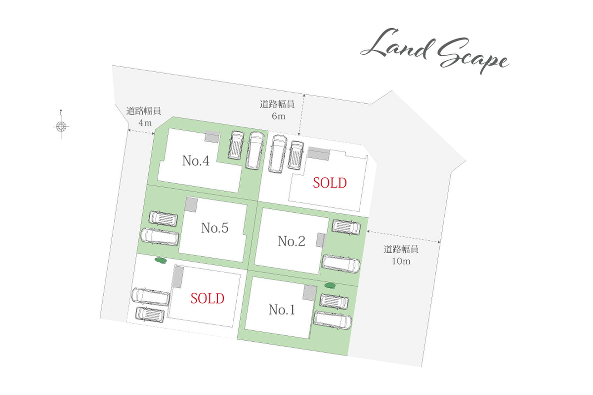 | 駐車場 | 2台 | 道路の幅員 | 東側10m公道(1~3号地)、北側6m公道(3・4号地)、西側公道(5・6号地)に接す |